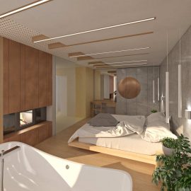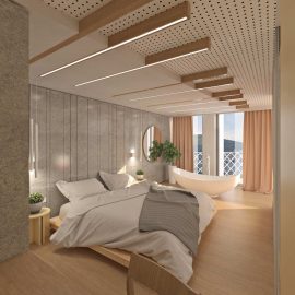 The largest of the three rooms has a magnificent sense of luxury. It consists of a gallery and a living area. There is a separated sleeping area with a king sized bed. Its design of wood and pastel tones with simple details enhances the exquisite views allowed from every direction, from the ocean to the forest. Set the mood in the evening with our four-sided wooden fireplace, a focal point found in the center of the room. The deluxe bathroom includes a toilet, sink, an infrared sauna, a freestanding rain shower, a separated freestanding bathtub.